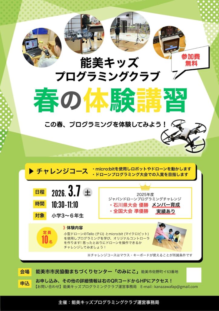 毎月第1・第2土曜日に能美市市民協働まちづくりセンター「のみにこ」にて、開講している「能美キッズプログラミングクラブ」の無料の「春の体験講習」を実施します。前回、2025年7月に開催した時はあっという間にうまってしまったため、春にも開催します。
